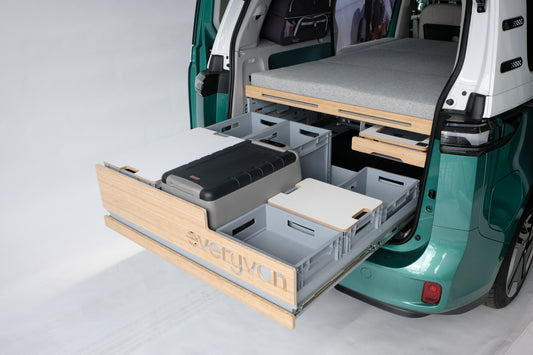 Dankzij het innovatieve ontwerp is de Everybox eenvoudig te installeren en weer te verwijderen, waardoor je bus multifunctioneel blijft. Het robuuste maar stijlvolle design past in vrijwel elke bus, zodat je moeiteloos kunt schakelen tussen dagelijks gebruik en avontuurlijke reizen.